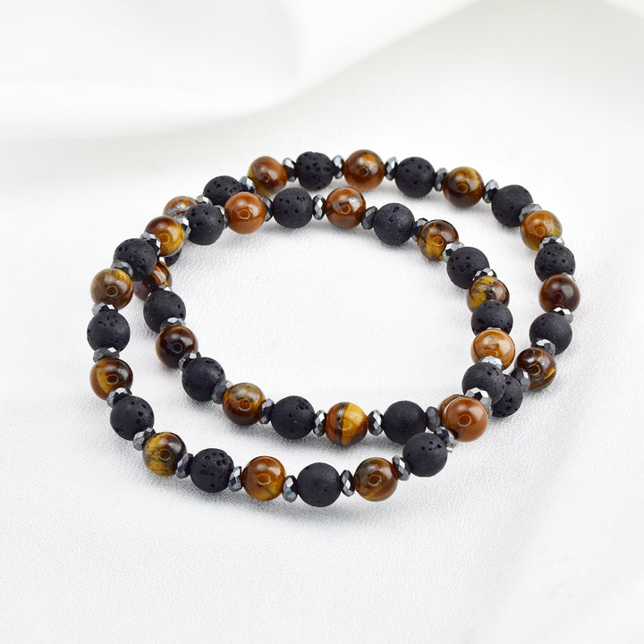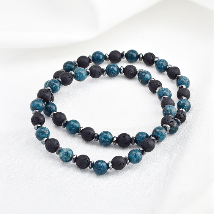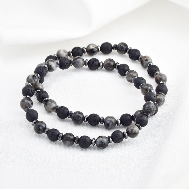 Elevate your accessory game with this natural stone beaded stretch bracelet. Featuring a sophisticated mix of polished stones and matte black lava beads, this piece is designed to ground your look with earthy tones and tactile texture. The 6.5mm beads are punctuated by small faceted spacers that add a touch of subtle shine without overpowering the natural elements. Available in tones of brown, grey and teal, crafted on a flexible stretch cord, this bracelet offers a snug yet comfortable fit for most wrist sizes. The unisex design makes it perfect for everyday wear - whether worn solo or stacked with other bracelets for a layered look full of personality and balance.