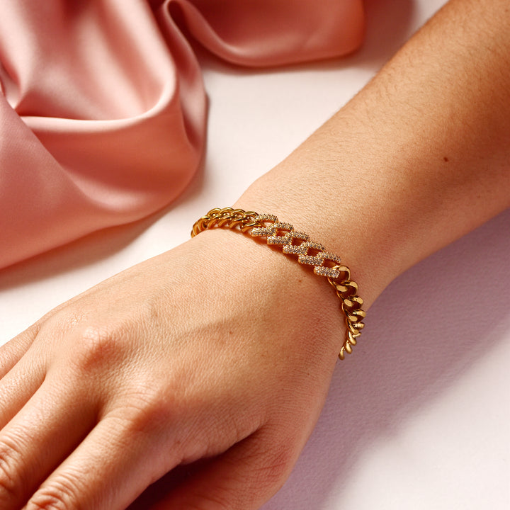 Make a bold statement with the Steel My Heart Gold-Tone Cuban Link Bracelet, designed for those who appreciate powerful elegance. Crafted from durable stainless steel, this bracelet features a classic Cuban link design elevated with a striking section of links encrusted in brilliant cubic zirconia stones. The polished gold-tone finish adds a luxurious touch, while the adjustable clasp ensures a secure and comfortable fit. Perfect for stacking or wearing on its own, this piece brings a confident edge to any look.