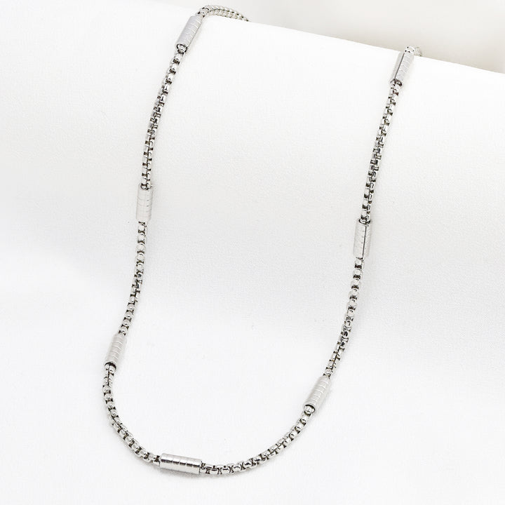 Sleek, lightweight, and refined - this cylinder accent box chain necklace brings understated elegance to everyday wear. Crafted from durable stainless steel, it features a delicate 2.7mm wide chain punctuated by evenly spaced cylindrical accents that add structure and visual rhythm. Its unisex design makes it a versatile staple for layering or wearing solo. With a generous length of 59.5cm, it sits comfortably on the chest and layers beautifully with shorter or chunkier chains. Finished with a secure lobster clasp, this necklace is perfect for those who appreciate clean design with just enough detail.