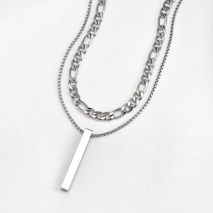 This 2-piece chain necklace set from Xcalibur delivers a layered look with bold masculine edge. Featuring two separate stainless steel chains one a solid 6mm curb chain and the other a slim 2mm box chain this versatile combo can be worn together or styled individually. The box chain is accented with a sleek vertical bar pendant giving the set a modern structured finish.