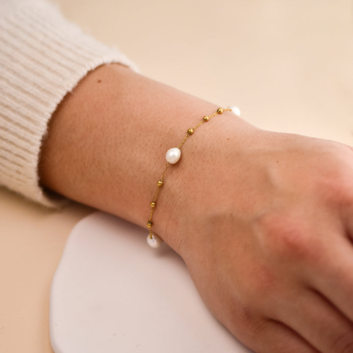 Delicate and timeless, this Gold-Tone Freshwater Pearl and Bead Chain Bracelet brings effortless elegance to any look. Featuring lustrous freshwater pearls spaced between polished gold-tone beads on a fine chain, this bracelet balances classic charm with modern minimalism. The adjustable clasp ensures a perfect fit, while the combination of organic and structured elements makes it ideal for both casual and refined styling. A versatile piece that's as graceful as it is stylish.