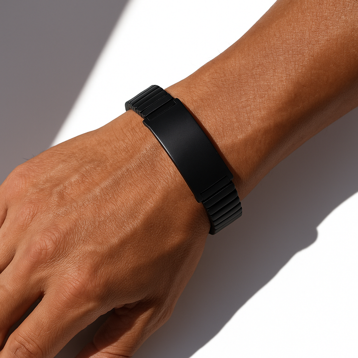 Its wide links give it a strong, masculine presence, while the central ID plate adds a modern, minimalist edge. Whether worn alone or paired with a watch or chain, this bracelet delivers a confident, understated statement.