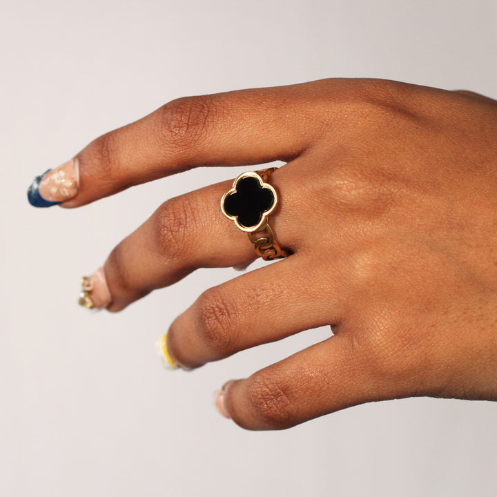 Stand out with the Steel My Heart stainless steel black clover link band ring, a bold yet elegant piece that combines modern design with timeless symbolism. Featuring a 14mm black clover centerpiece set on an intricate gold-tone link band, this ring makes a striking statement. Crafted from durable stainless steel, it is waterproof and designed for long-lasting wear. Available in various sizes to suit your perfect fit, this ring is ideal for adding a touch of unique sophistication to your jewellery collection.