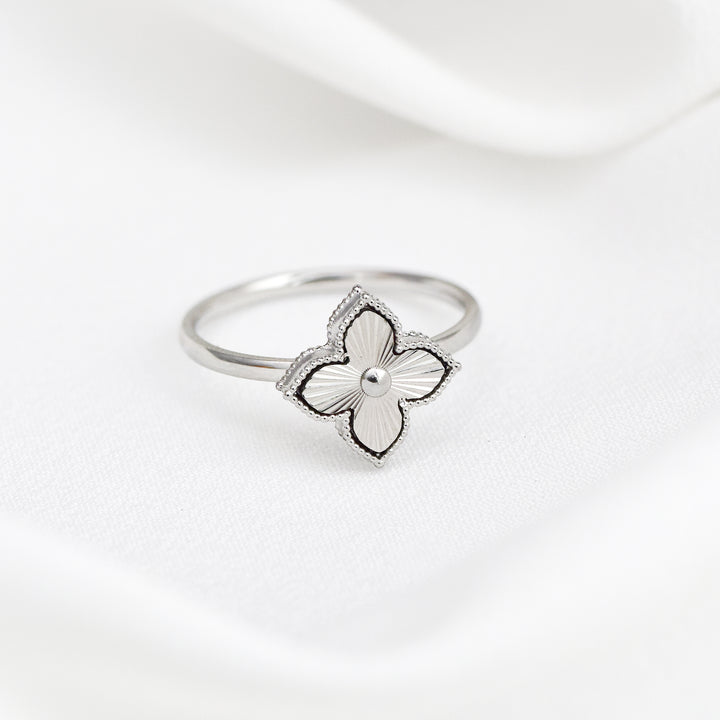 Elevate your jewellery collection with the Lily & Rose waterproof stainless steel flower ring. Featuring a finely textured clover motif on a sleek band, this ring blends timeless elegance with modern simplicity. Crafted from durable stainless steel, it is waterproof and designed to retain its shine and strength over time.