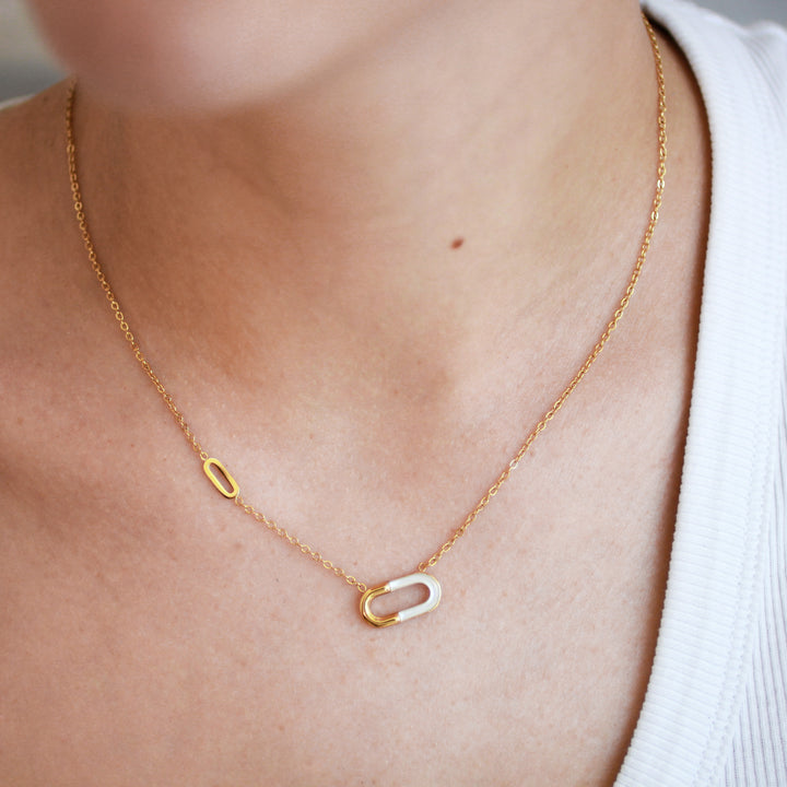 Fully waterproof, it's designed for long-lasting wear without tarnishing or fading. The modern oval charm detail in white and gold enamel makes this a standout piece - perfect for layering or wearing solo.