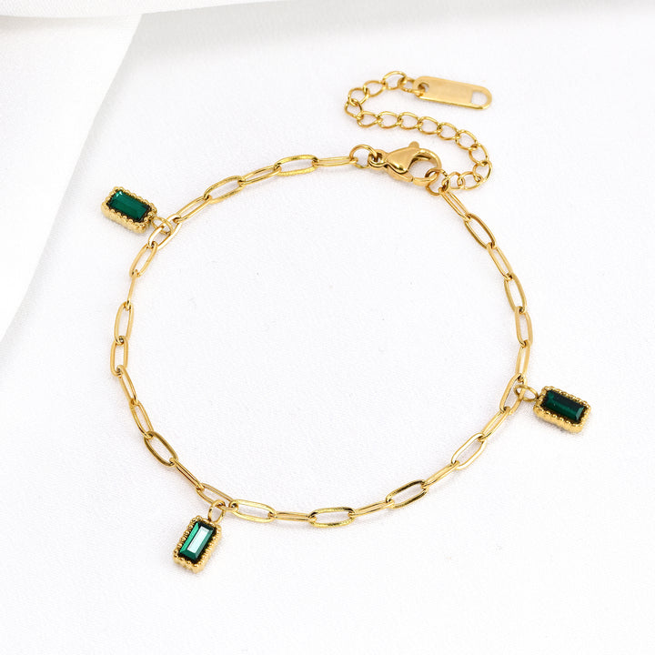 The Steel My Heart Paperclip Charm Bracelet adds a vibrant touch of color to your everyday style. Crafted from stainless steel with a radiant finish, this bracelet features a modern paperclip link chain adorned with three rectangular green stone charms in a detailed frame setting. The secure lobster clasp ensures durability, while the adjustable extension chain allows for a comfortable and flexible fit. Elegant yet playful, this bracelet is perfect for layering or wearing as a statement piece on its own.