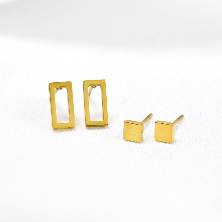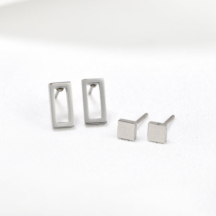 The Steel My Heart waterproof stainless steel minimalist rectangle & square stud earring pack embodies modern simplicity and everyday elegance. Crafted from high-quality waterproof stainless steel, these geometric studs offer a sleek polished finish that resists tarnish and maintains their refined shine over time. This versatile pack includes two distinctive designs open rectangular studs for a bold architectural edge and solid square studs for a classic understated look. Perfect for mixing, matching or layering across multiple piercings, they transition effortlessly from casual wear to sophisticated occasions. Available in both silver and gold plating, this minimalist duo complements any style, adding a subtle yet striking accent to your everyday ensemble.