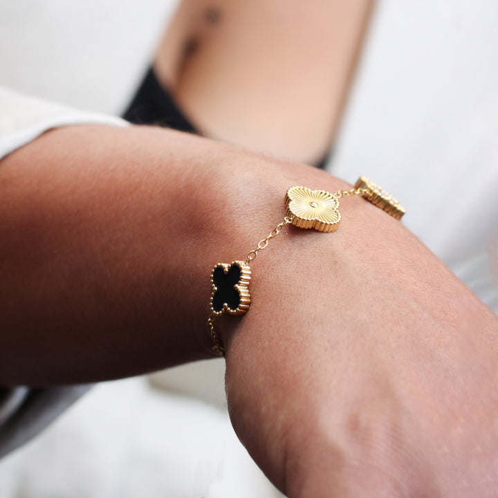 The Steel My Heart Clover Charm Bracelet blends timeless elegance with everyday versatility. Crafted from durable stainless steel, this bracelet is waterproof, ensuring long-lasting shine and resistance to tarnish. It features a fine chain adorned with alternating clover-shaped charms in a glossy enamel finish and textured gold detailing for added contrast. The secure lobster clasp and adjustable extension chain provide a comfortable, tailored fit. Perfect for layering or wearing on its own, this bracelet adds a refined yet modern touch to any outfit.