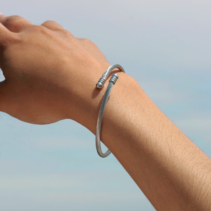 Elevate your everyday style with the Steel My Heart waterproof stainless steel cable wire bangle. Designed with a sleek twisted cable pattern and polished stainless steel ball ends, this versatile bangle is perfect for layering or wearing on its own as a statement piece. Crafted from premium waterproof stainless steel, it resists tarnish, rust and discoloration, ensuring long-lasting shine and durability. The flexible open-cuff design makes it easy to slip on and off while providing a comfortable fit for daily wear. Its timeless yet modern design makes it suitable for both casual and formal looks, offering effortless style for every occasion. Whether worn solo for a minimalist edge or stacked with other Steel My Heart bangles, this piece is an essential addition to your collection. Diameter: 65mm Width: 7mm